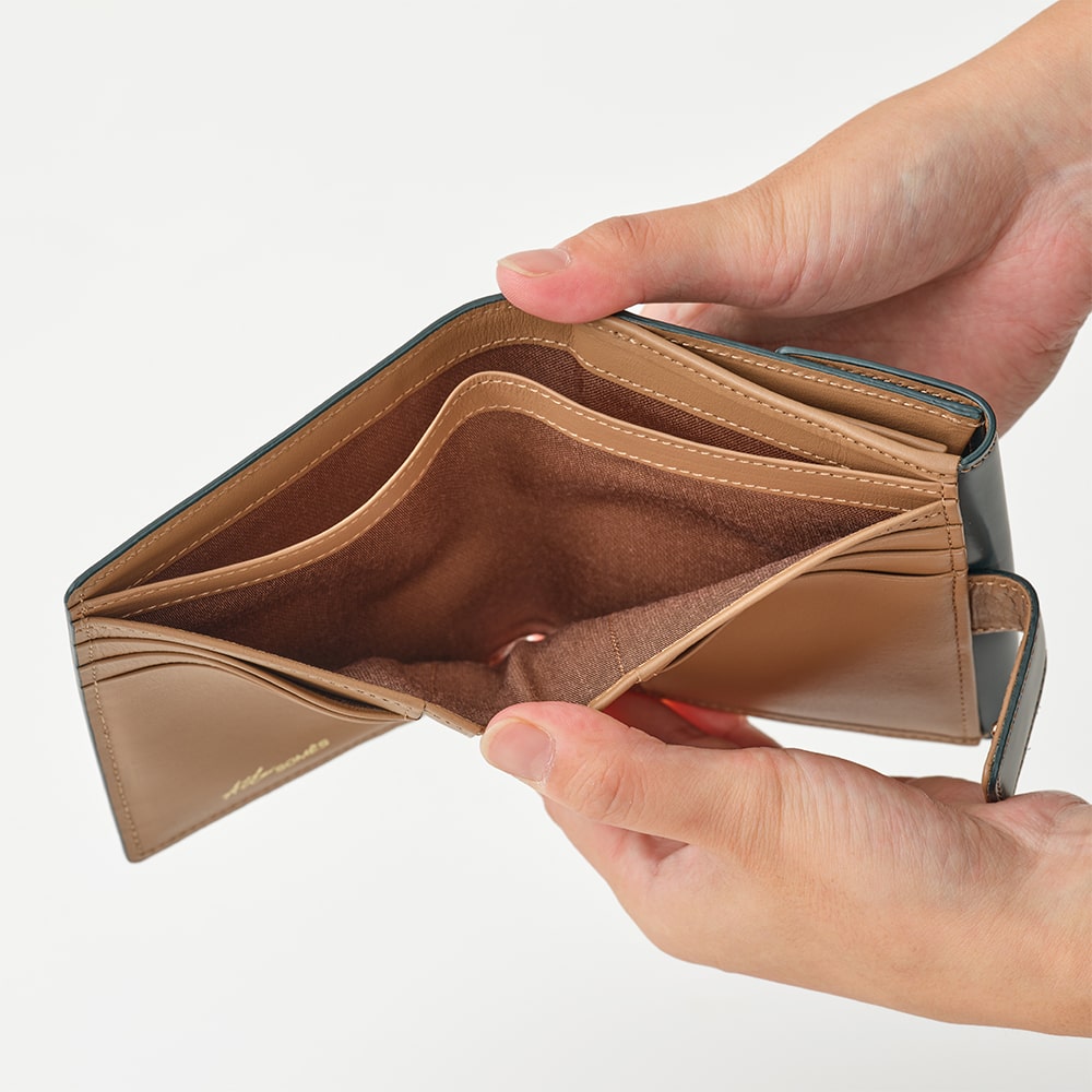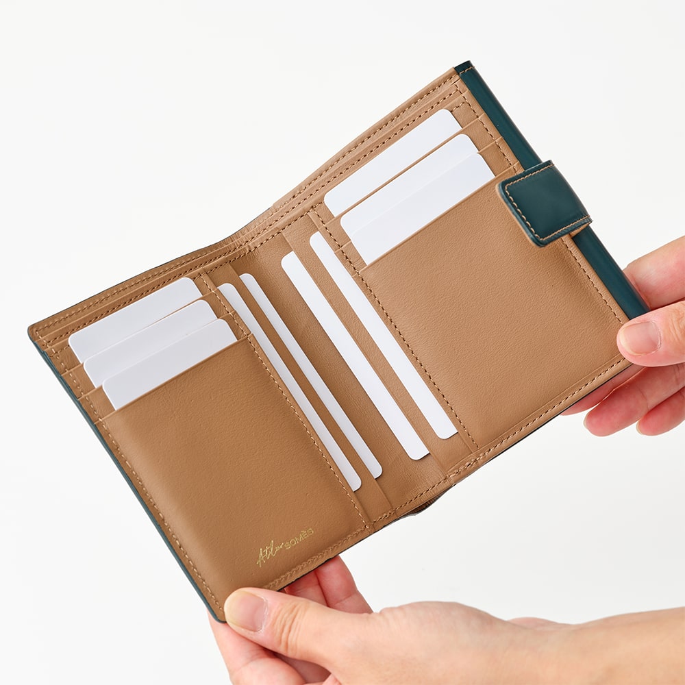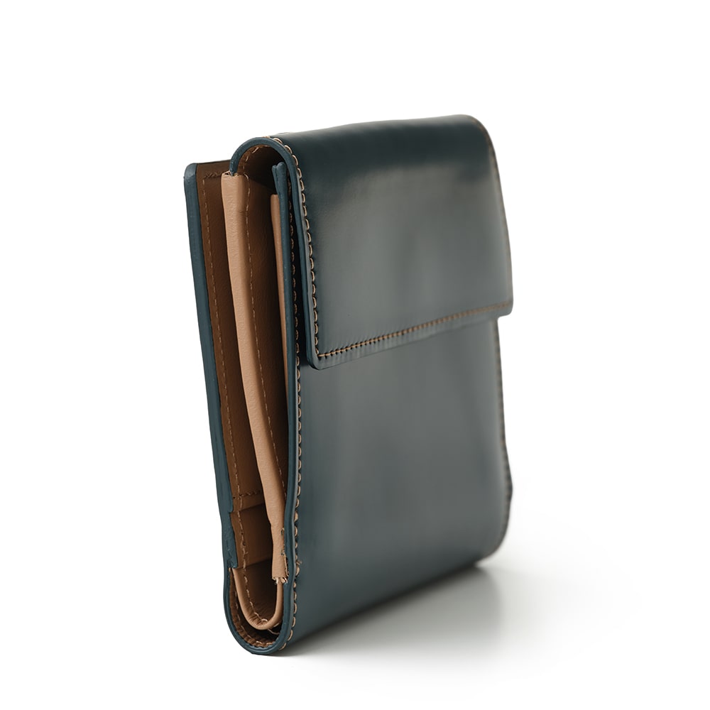 端正な佇まいとコードバンの艶が際立つ二つ折り財布。手に取るたびに、素材の美しさと上質さを感じられます。
