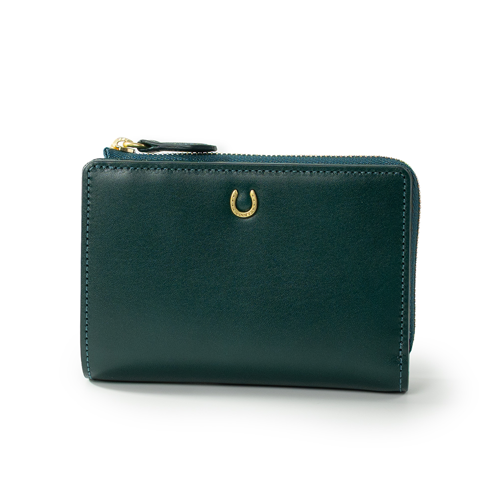 艶めくヌメ革に、幸運のモチーフ蹄鉄を添えた「ピルエット」シリーズのLF折財布。
