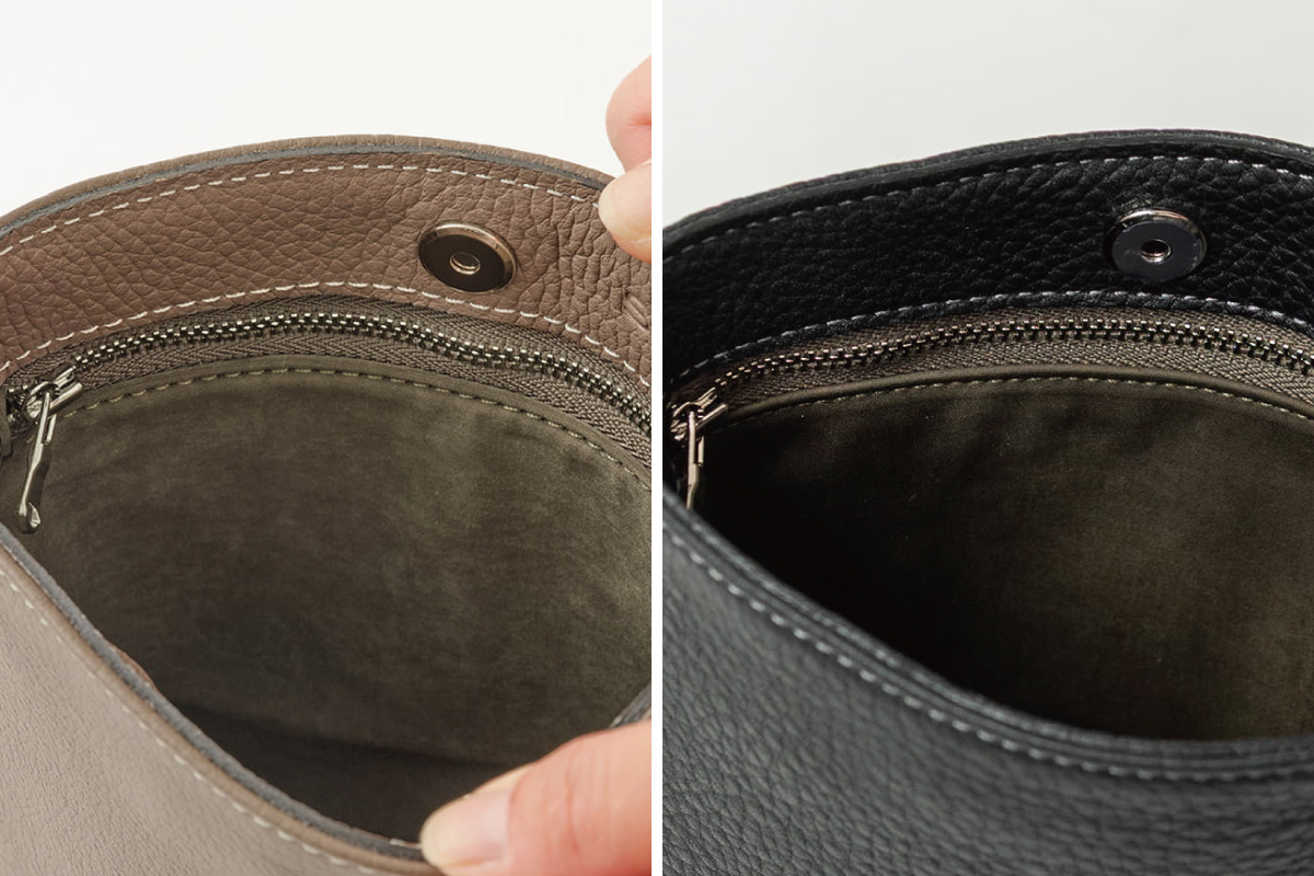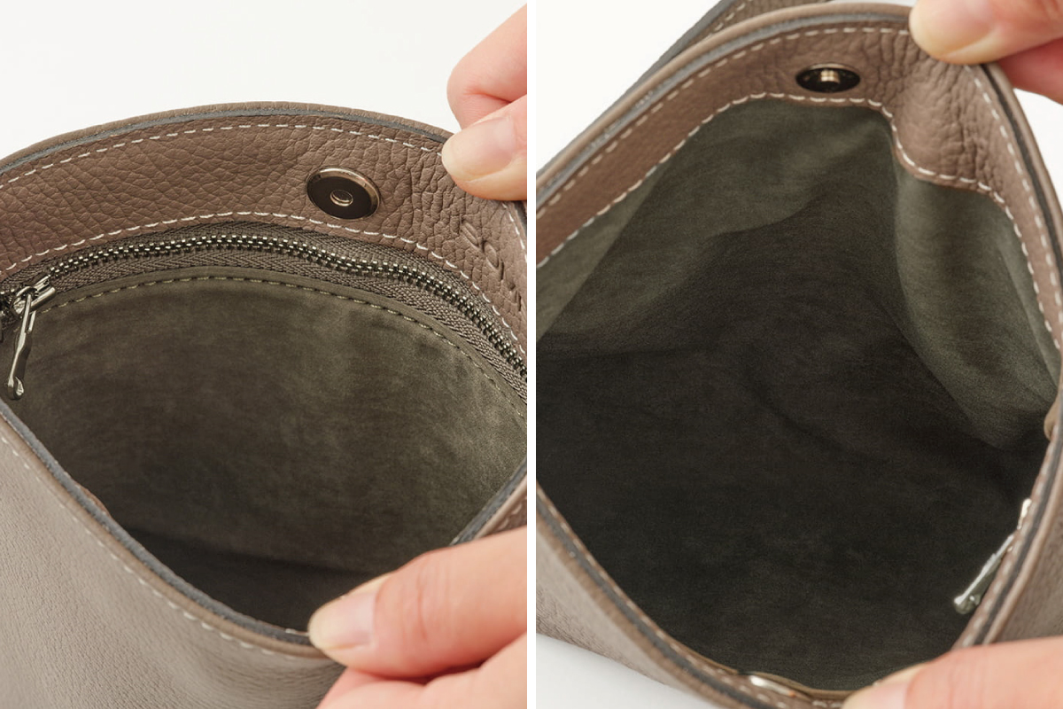 財布やスマートフォンなど、必需品をすっきり収められるサイズ感。細かな仕切りは設けず、内装はポケットひとつのシンプルな構成です。