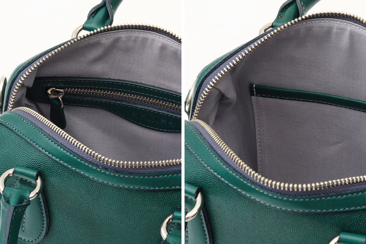 内装の両サイドにはポケットを備え、パスケースや鍵などの小物整理に重宝します。
