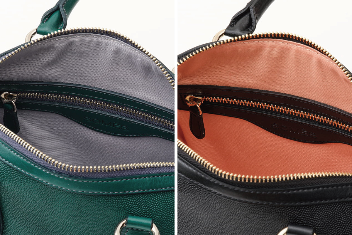 ハンドルやファスナー周りには、型押しを施していない同色の革を使用。