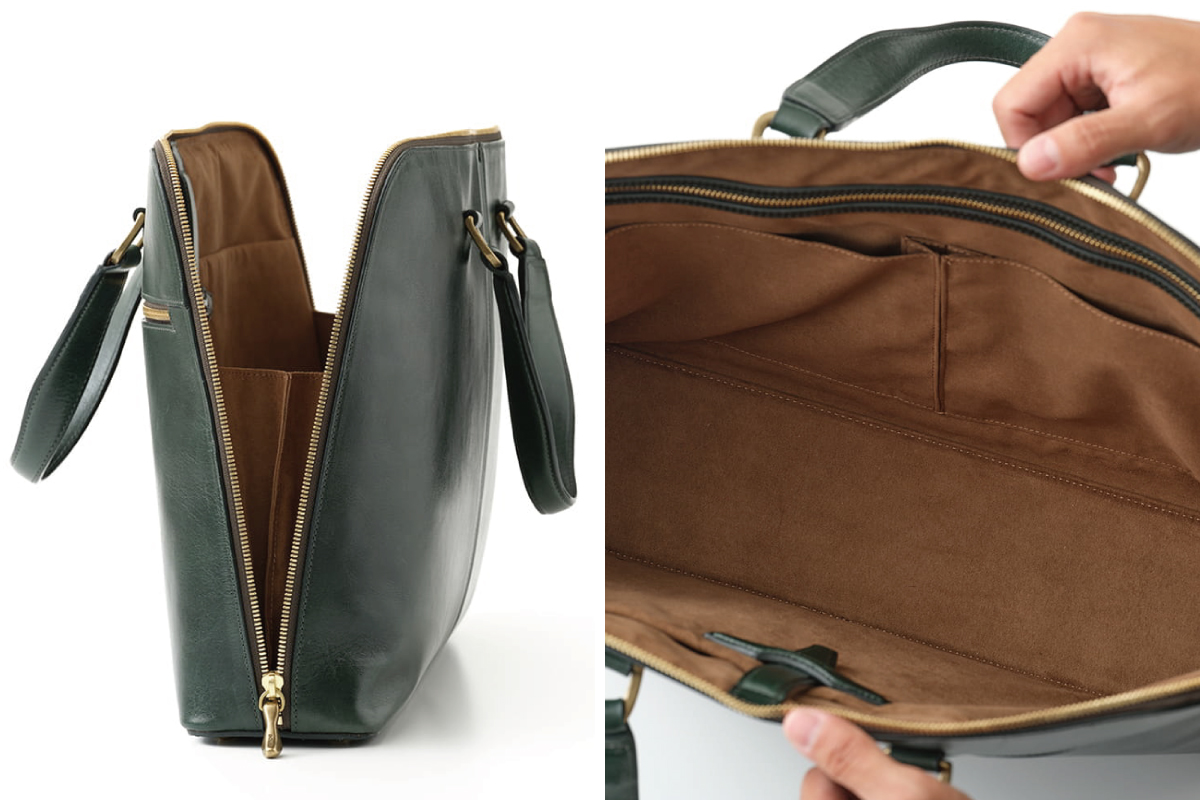 底面まで大きく開くファスナー構造で、持ち物の出し入れも滑らかに。